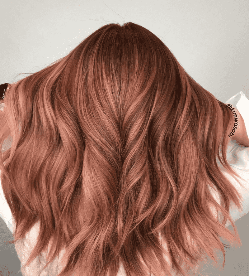 Rose gold balayage on black hair creates an elegant and romantic appeal. The warm pink and gold tones gently highlight the natural texture of the hair.