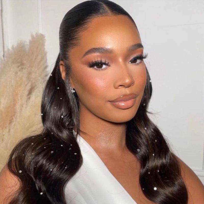 The half-up, half-down style is a versatile choice that combines elegance with ease. This look allows for creativity, blending loose flowing hair with a styled top section.