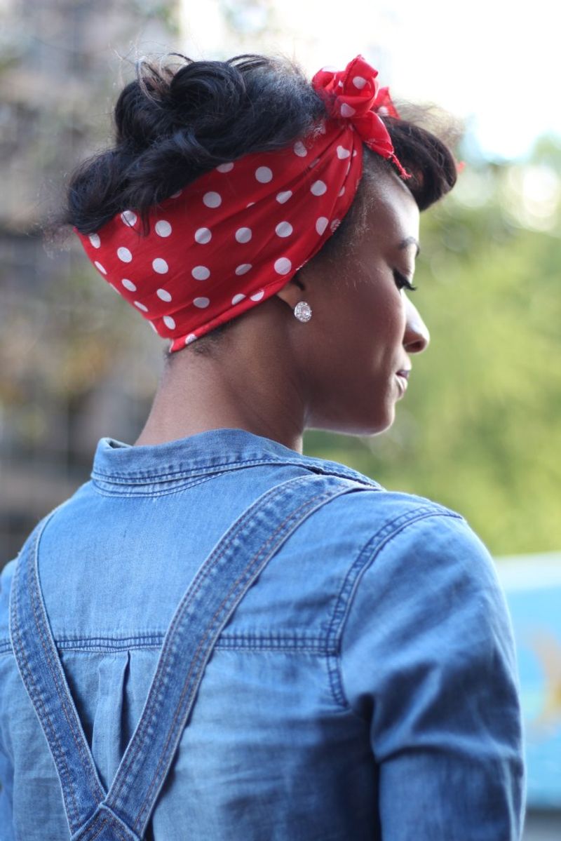 Pair it with a bold red lip and rolled-up sleeves for added authenticity. The Rosie bandana is more than a hairstyle; it’s a statement of resilience and independence.