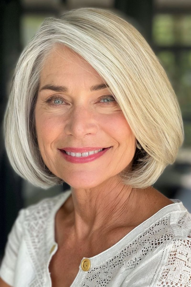 The textured bob offers a fresh and lively look for women over 70. This style incorporates subtle waves, adding volume and movement to the hair, making it appear fuller and more vibrant. Perfect for a cozy café visit or a casual day out.